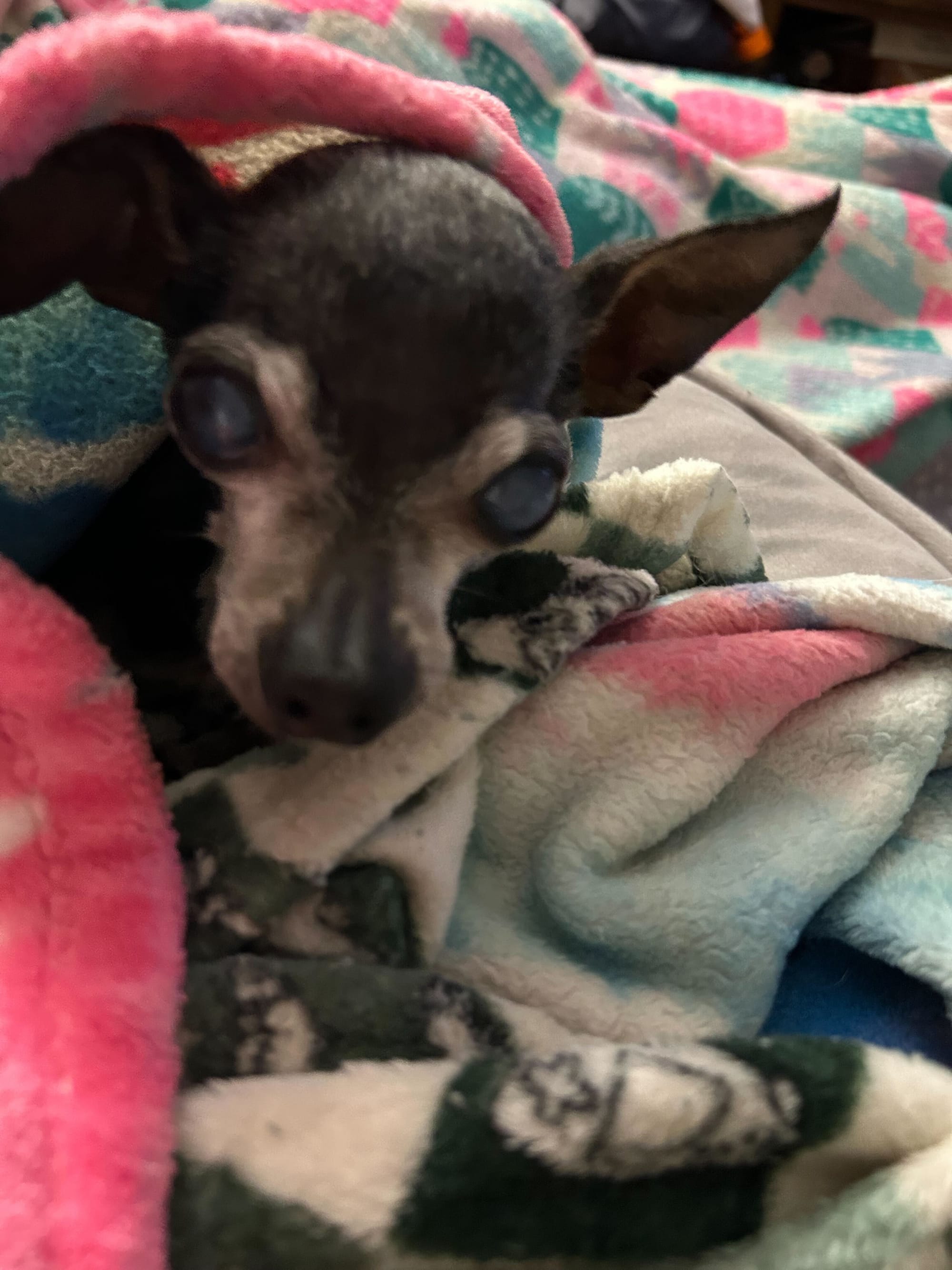 She's doing better, thankfully, but not hard to see that she's degrading. At this point, it's just ensuring whatever time she has left is happy and restful. But she's had a remarkable story. My partner literally watched her be born and has had her ever since. She had a heart murmur as a puppy and needed open-heart surgery – not an easy task for a chihuahua puppy. My partner's family was also destitute, so she worked odd jobs as a teenager and worked with a vet to raise the funds. I think that's part of the reason she became a veterinarian, so there's a lot wrapped up in this little dog – outside of her just being lovable.