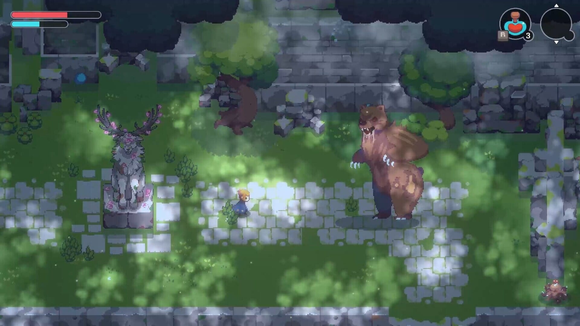 This is a Soulslike through and through, with bonfire-like checkpoints, a currency you an recollet if you die, and methodical combat. But there are also Zelda-like puzzle elements woven in as well, and a story about fighting for the conservation of a magical forest where animals, including some of your friends, have been infected by a curse.